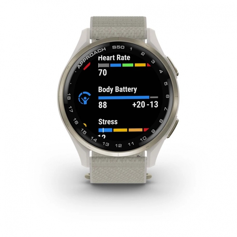 Zyskaj wszystkie funkcje potrzebne na polu golfowym — i poza nim — dzięki zegarkowi Garmin Approach S50 Ivory.
