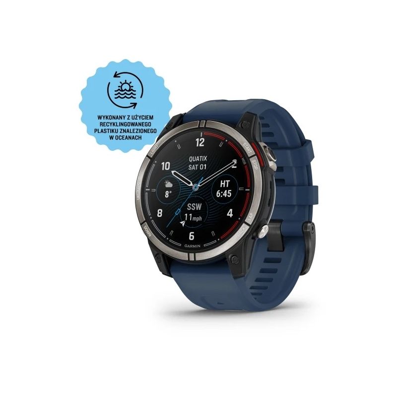 Ten wytrzymały zegarek jest wyposażony w duży wyświetlacz AMOLED o przekątnej 1,3″ i odporne na zarysowania szkiełko szafirowe. 100% tworzyw sztucznych użytych do produkcji obudowy urządzenia pochodzi z plastiku odzyskanego z obszarów, w których mógłby trafić do oceanu.