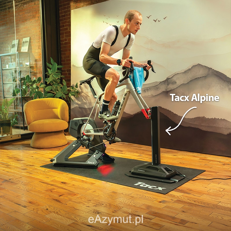 Podnieś poziom treningu na trenażerze, dzięki Tacx Alpine — symulatorowi nachylenia, który działa z inteligentnymi trenażerami rowerowymi Tacx NEO 3M oraz 2T i może odwzorować nachylenie od 25% do −10%.