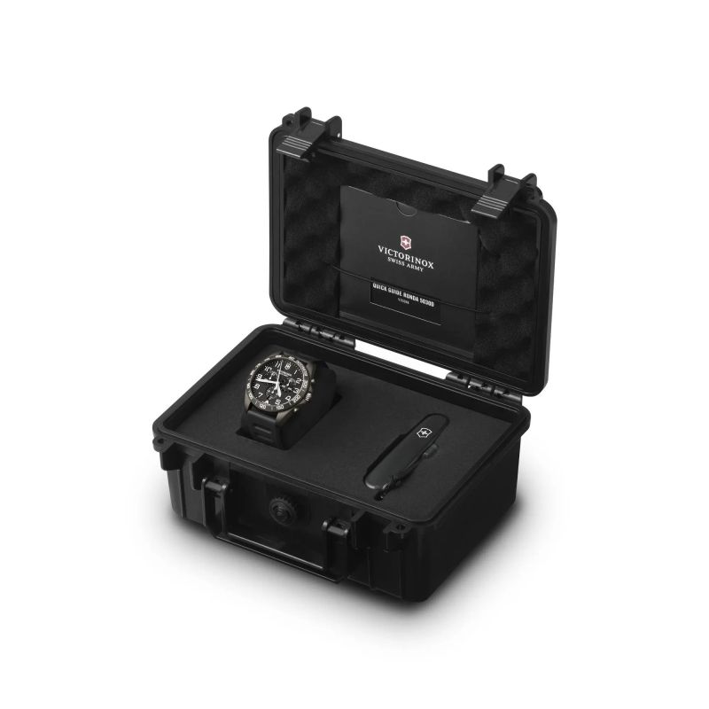 Sportowy charakter i modny styl: prezentujemy nowy model FieldForce Sport Chrono. Ten utrzymany w monochromatycznej tonacji zegarek jest połączeniem niezwykle modnego wzornictwa oraz wysokiej funkcjonalności. Ciemniejsza kolorystyka koperty i pierścień z matowego PVD stanowią efektowne tło dla jaśniejszych wskazówek i indeksów numerycznych pokrytych odblaskową powłoką SuperLuminova®. Technologia ta gwarantuje lepszą czytelność 24/7, bez względu na porę dnia i oświetlenie. Funkcjonalność modelu dodatkowo podnosi dołączony do zestawu ekskluzywny scyzoryk Spartan PS z matowymi okładkami. To odważny, solidny zestaw sportowym stylu.
